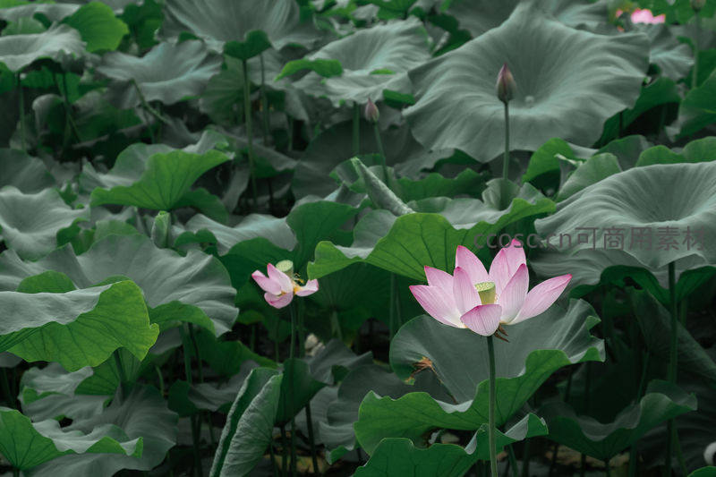 粉荷点缀碧叶间,满池清雅