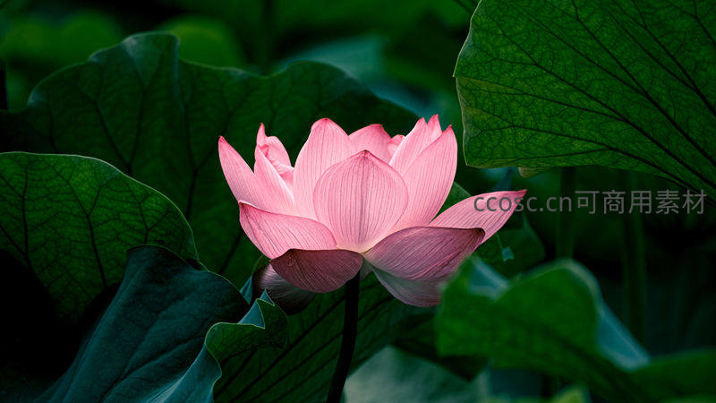 一朵盛开的粉红色莲花被层层叠叠的深绿色荷叶温柔环绕,花瓣细腻柔美,在幽暗背景的衬托下更显娇艳脱俗,散发着宁静而高洁的气息。
