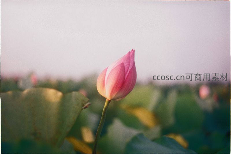 一朵粉嫩的荷花在晨光中静静绽放,背景是朦胧的荷塘与天空,营造出宁静祥和的氛围。