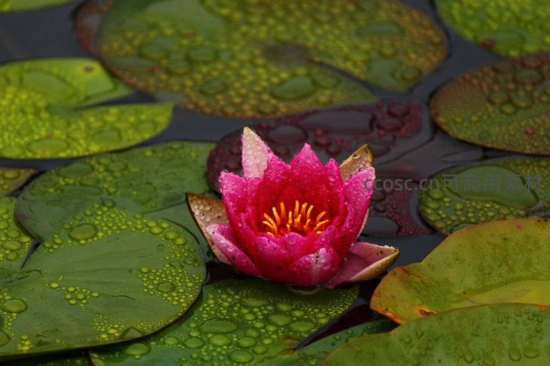雨后的池塘中,一朵深红色的睡莲静静浮于水面,花瓣与荷叶上布满晶莹水珠,生机盎然。