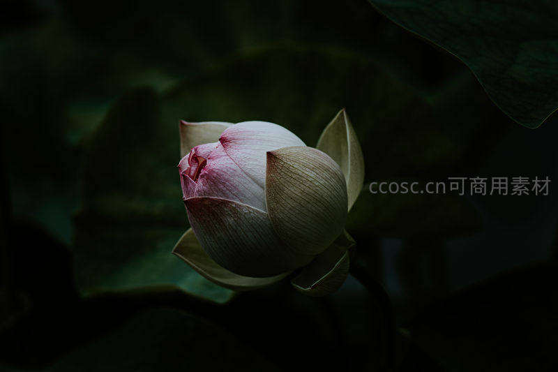 在深色背景的映衬下,一朵含苞待放的莲花显得格外清雅,花瓣上细腻的纹理和淡粉的色泽传递出生命的静谧与力量。