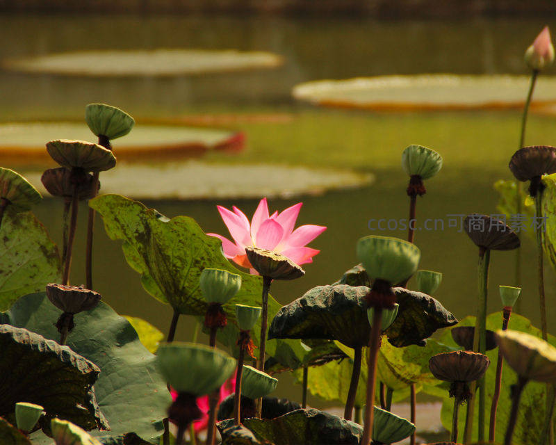 金色夕阳照耀下,一朵粉红莲花在众多荷叶与莲蓬间傲然绽放,背景虚化的巨大荷叶与暖光共同渲染出温暖而富有生命力的田园景象。