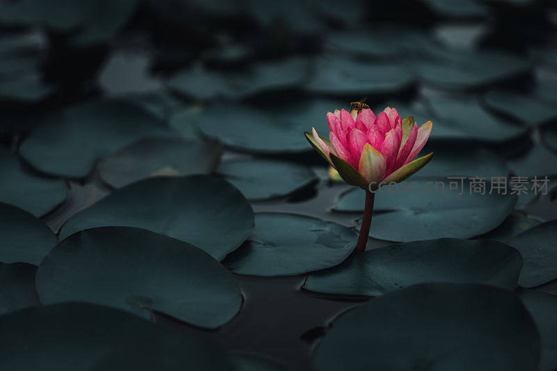 蜜蜂停驻粉红睡莲上,暗色荷叶为背景