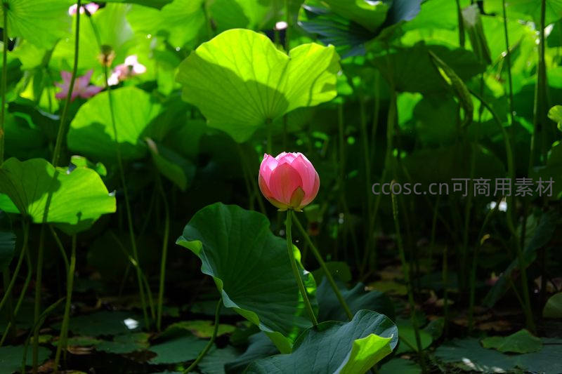 阳光洒在茂密的荷塘上,一株粉红荷花在绿叶丛中亭亭玉立,光影交错,尽显夏日的蓬勃生命力。