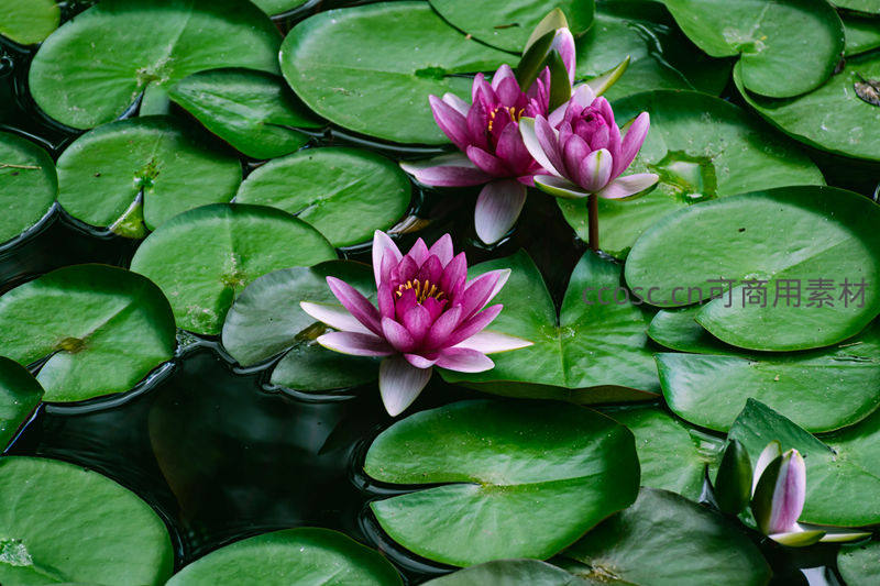 几朵娇艳的紫色睡莲在深色水面上静静绽放,周围环绕着圆润的绿色浮叶,营造出幽静而雅致的水生植物景观。