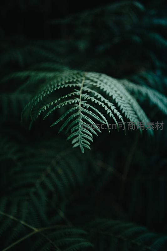 在幽暗的森林背景下,一片蕨叶的细节被清晰捕捉,其精致的叶脉和深邃的绿色营造出宁静而神秘的自然氛围。
