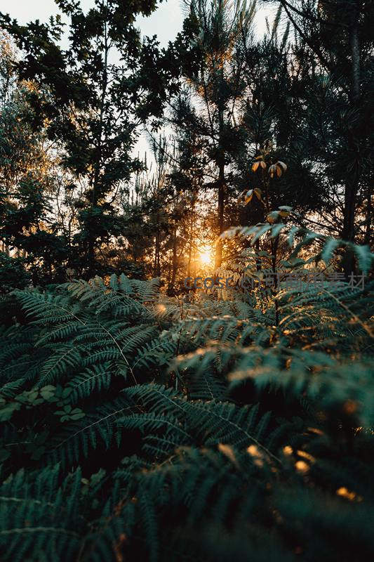 夕阳穿透林间蕨丛