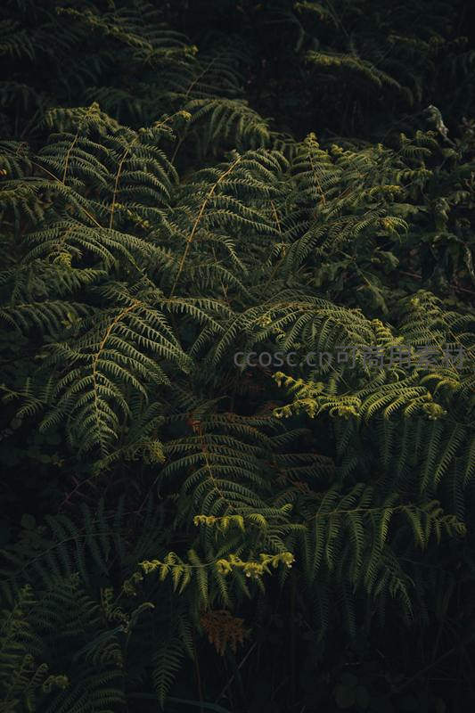 在一片浓密的蕨类植物中,几簇鲜嫩的黄绿色新芽悄然萌发,为深沉的绿色背景注入了活力与希望的象征。