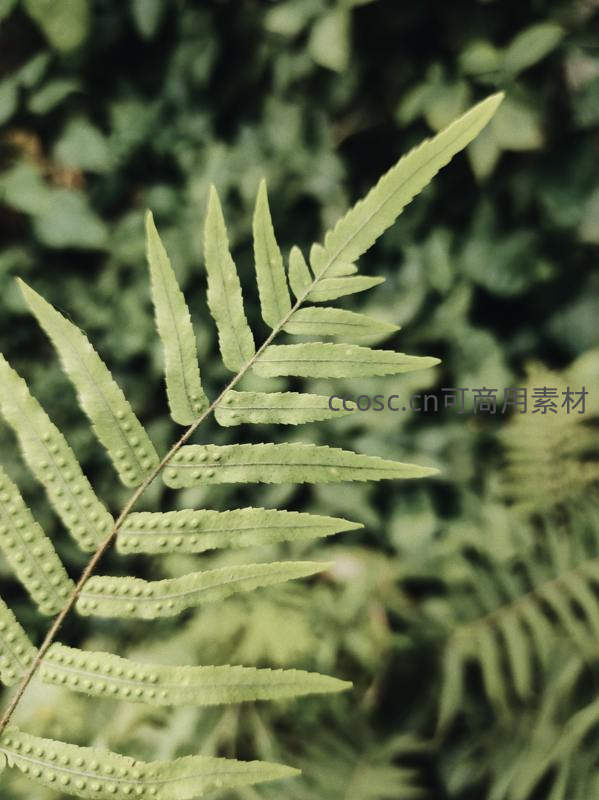 这张照片聚焦于蕨类植物叶片的背面,上面密布着用于繁殖的孢子囊群,呈现出独特的点状纹理,背景是模糊的绿色植被,突出了植物的自然生长状态。
