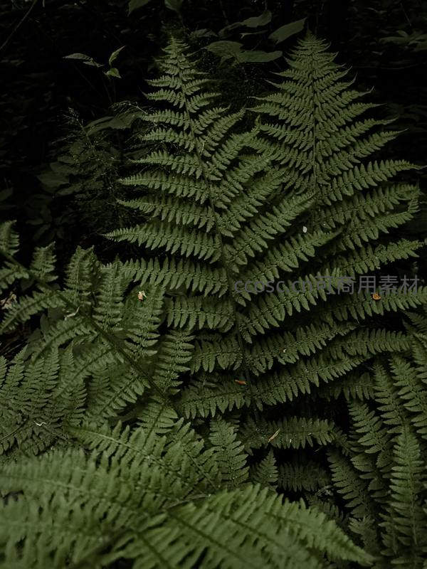 大片茂盛的蕨类植物层层叠叠,构成了一片浓密的绿色海洋。深浅不一的绿色调和错综复杂的叶形,展现了原始森林中旺盛而和谐的生态系统。