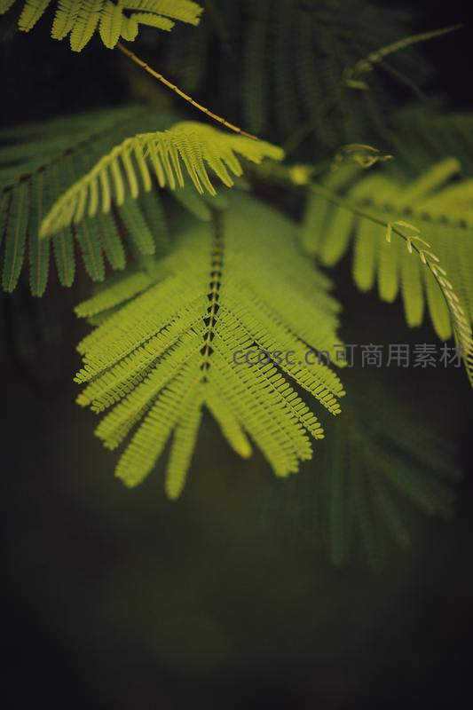 一片嫩绿色的羽状复叶在深色背景的映衬下显得格外明亮,光线从叶隙间穿透,突显其精致的结构与鲜活的生命力,营造出一种静谧而富有诗意的视觉效果。