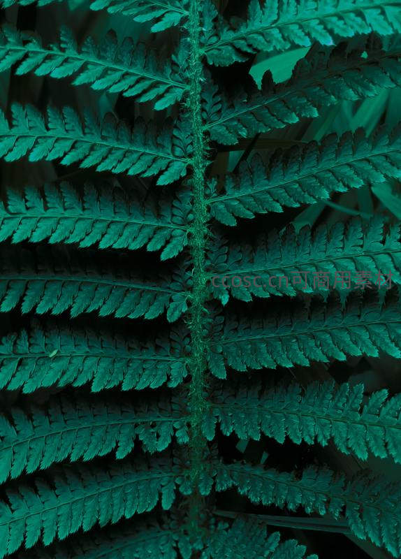 在幽暗光线下,蕨叶呈现出迷人的蓝绿色调,茎干两侧的叶片形成完美的对称结构,营造出一种宁静而神秘的视觉氛围。