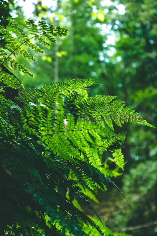 一束阳光穿透茂密的森林,照亮了前景中舒展的蕨叶,背景的虚化效果突出了主体,传递出清晨林间的宁静与活力。