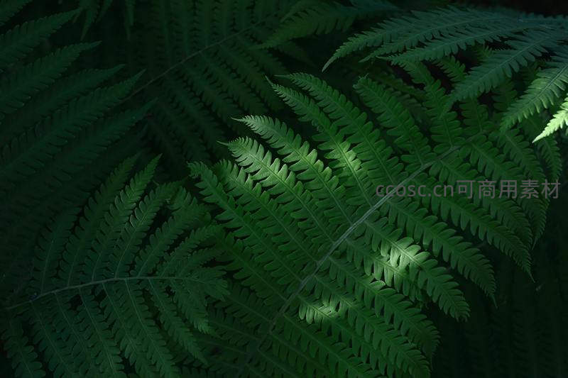 在幽暗的背景中,蕨叶的精致纹理与脉络在微弱光线下清晰可见,展现出植物在阴影里蕴藏的生命力与静谧之美。