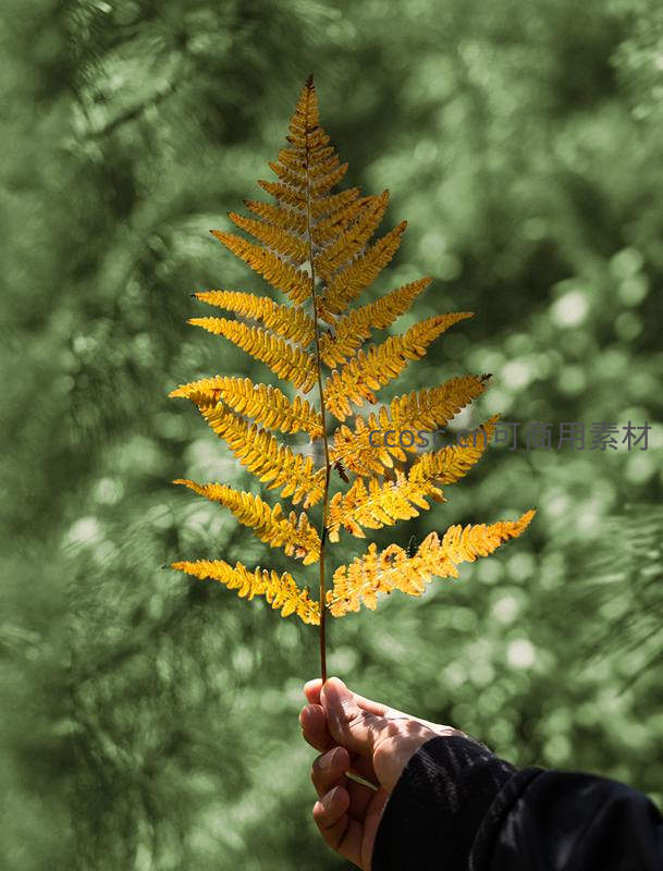 一只手轻轻托举着一片金黄色的蕨叶,与背后模糊的绿色树林形成鲜明对比,捕捉了秋日里温暖而宁静的瞬间。
