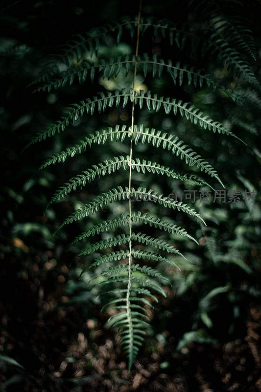 一片修长的蕨叶在斑驳的林间光线下静静垂挂,其清晰的脉络和周围的朦胧背景共同营造出宁静致远的意境。