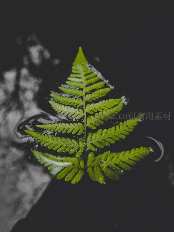 一片鲜绿的蕨叶静静漂浮在幽暗的水面上,周围荡开细微的涟漪,叶片与水波相映成趣,营造出宁静而诗意的氛围。