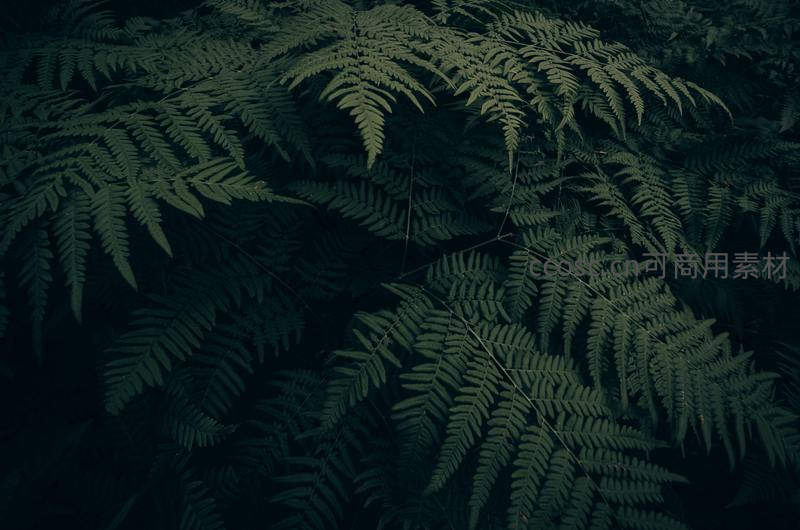 深绿蕨叶在幽暗森林中层层叠叠