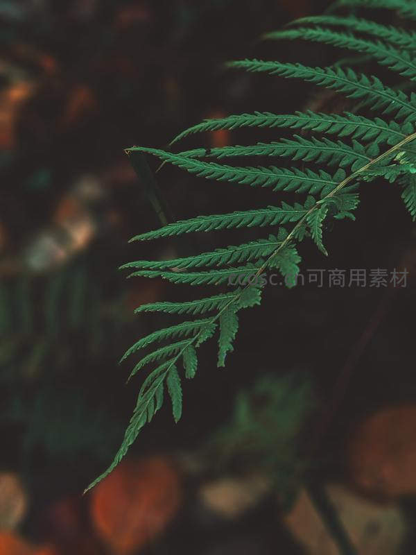 一支形态优美的翠绿蕨叶在浅景深效果下从模糊的林地背景中脱颖而出,其边缘的锯齿和细腻纹理清晰可见,充满自然灵动之美。