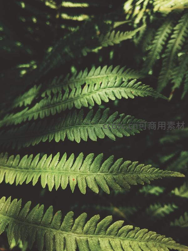 在明亮阳光的照射下,几片蕨叶呈现出鲜嫩欲滴的翠绿色,叶面的脉络与质感在光线下一览无余,充满了蓬勃向上的自然活力。