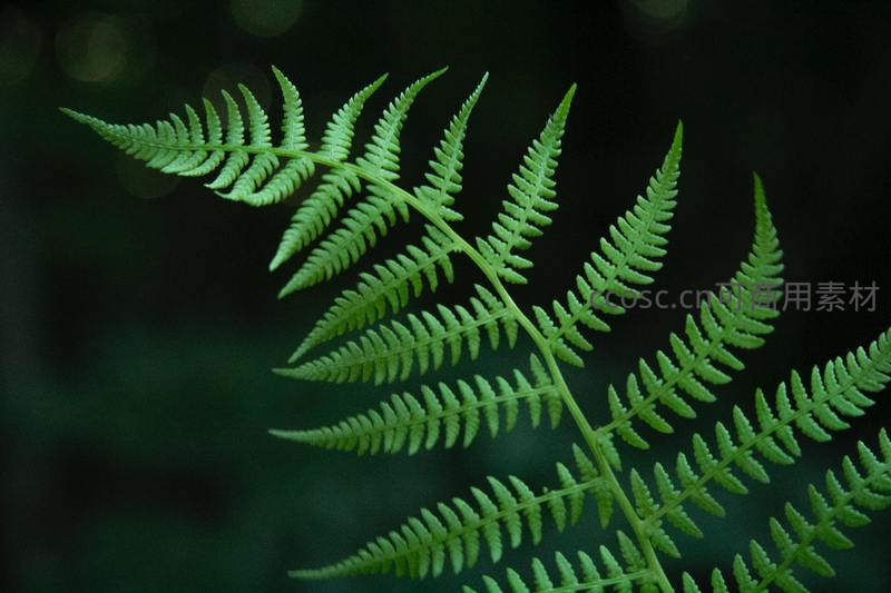 一片充满活力的嫩绿色蕨叶在深色虚化背景的衬托下显得格外醒目,其舒展的姿态和清晰的脉络细节,生动地诠释了生命在自然中的蓬勃与纯净之美。