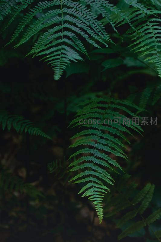 在幽暗的森林深处,几片翠绿的蕨叶在微弱光线下舒展,其精致的纹理和饱满的色泽彰显了原始森林中蓬勃的生命力。