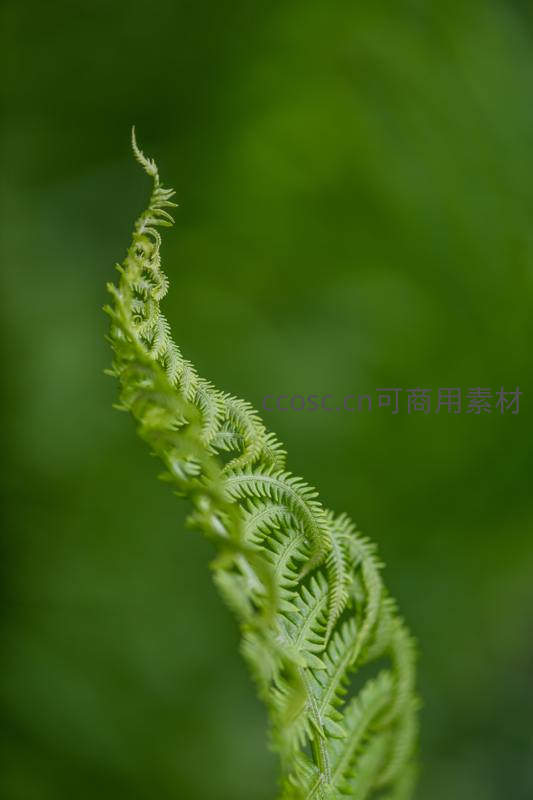 一片嫩绿的蕨类新叶在纯净的绿色虚化背景前优雅舒展,其细腻的叶脉和柔和的光泽,传递出春日里最纯粹的生机与希望。