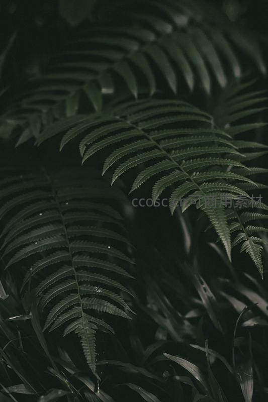 在昏暗的林间,深绿色的蕨类叶片层层叠叠,脉络清晰,水珠点缀其间,展现出原始而宁静的自然生命力。