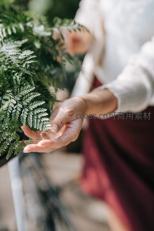 一双纤手轻轻托住带有银色边缘的蕨叶,阳光穿过叶隙,在皮肤上投下斑驳光影,捕捉到人与植物亲密互动的温馨时刻。