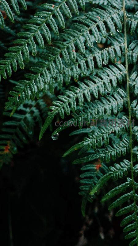 水珠悬垂于深绿蕨叶尖端的微观景象