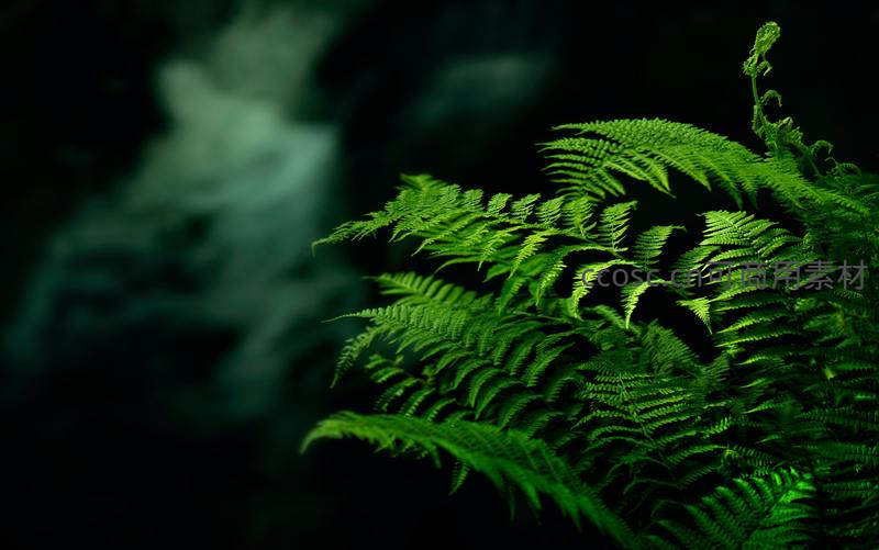 一簇鲜亮的绿色蕨叶在近乎全黑的背景中显得格外醒目,强烈的明暗对比突出了其鲜活的质感与不屈的生命能量。