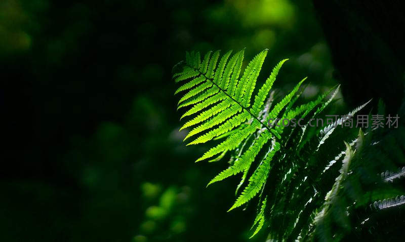 一束阳光精准地打在单片蕨叶上,使其边缘泛起金边,半透明的叶脉清晰可见,背景虚化成深绿,尽显自然的精致与温柔。
