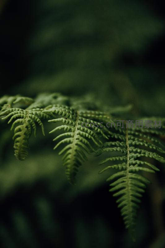 在幽暗的背景中,一片翠绿的蕨叶被特写镜头捕捉,其精致的叶脉与柔嫩的质感展现出大自然的生命力与宁静之美。