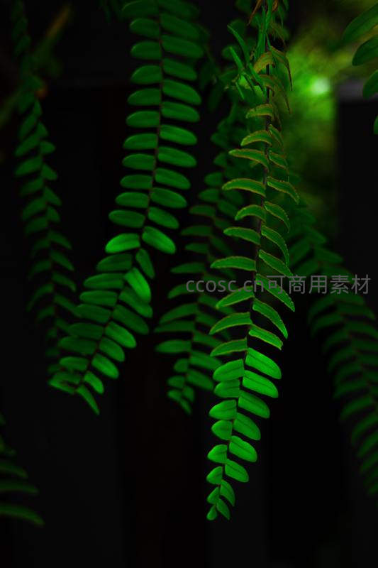 垂吊蕨叶在暗背景下焕发鲜亮绿意