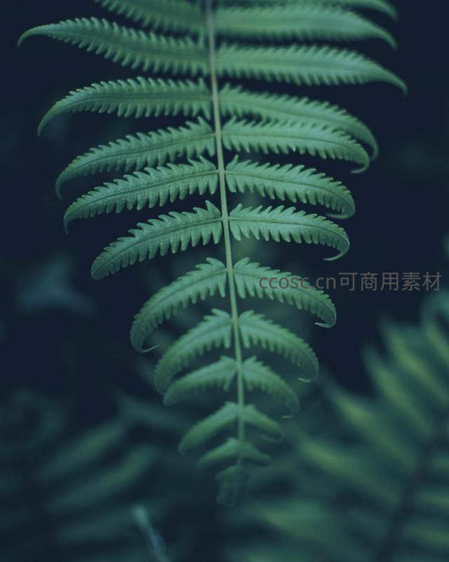 在深色模糊背景的衬托下,一片鲜嫩的蕨叶被清晰捕捉,其边缘锯齿与叶脉纹理纤毫毕现,展现出自然界的精致与宁静。