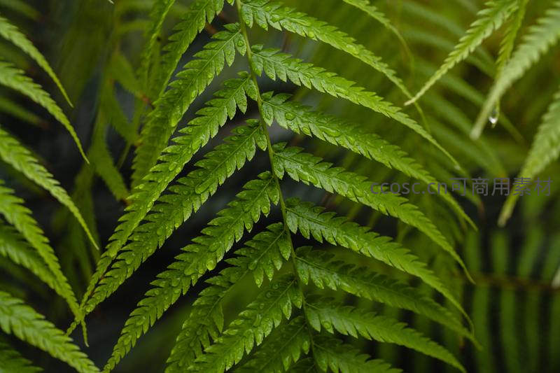 雨后阳光下,翠绿的蕨类叶片上挂满晶莹水珠,脉络清晰,展现自然生命的细腻与活力。
