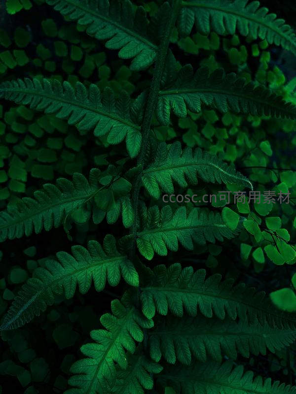 在幽暗背景下,翠绿的蕨叶舒展伸展,叶脉纹理清晰可见,展现出植物原始而蓬勃的生命力,充满自然野趣。