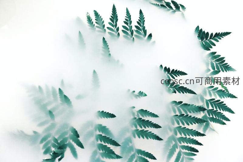 青翠的蕨叶漂浮于乳白色雾气之中,虚实相生,宛如一幅淡雅的东方水墨画,营造出空灵、宁静的诗意氛围。