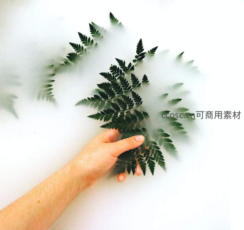一只温柔的手轻托着一簇深绿蕨叶,周围弥漫着如牛奶般的浓雾,画面纯净梦幻,传递出人与自然和谐共生的美好意境。