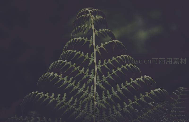 在深色背景下,逆光勾勒出蕨叶的优雅轮廓,纤细的叶脉与对称的结构清晰呈现,如同一件精雕细琢的自然艺术品,静谧而富有韵律。