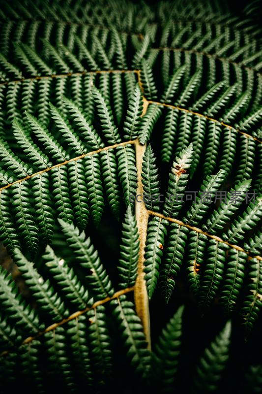 近距离聚焦蕨叶主茎与羽状小叶,棕黄色茎干与翠绿叶片形成色彩对比,展现植物内部精妙构造,体现自然界的细致之美。
