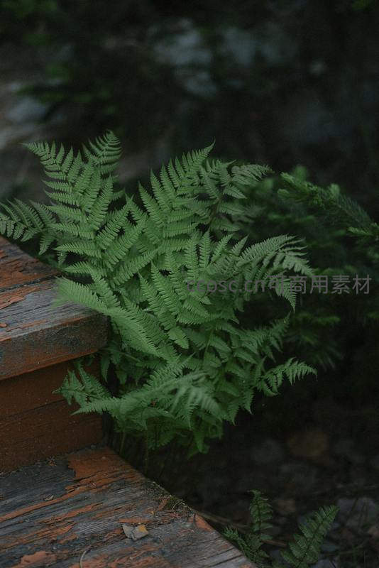 在斑驳的木质台阶旁,一丛茂盛的蕨类植物在幽暗的林荫下悄然生长,为静谧的户外空间增添了一抹自然的野趣与生命力。