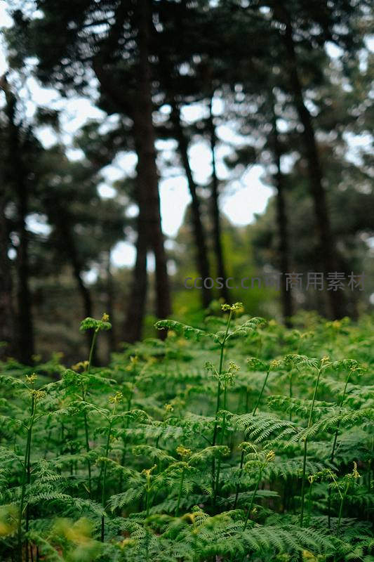 在高大树木的掩映下,一片茂密的蕨类植物覆盖了林间空地,形成一道生机勃勃的绿色地毯,展现了森林生态系统的原始与丰饶。