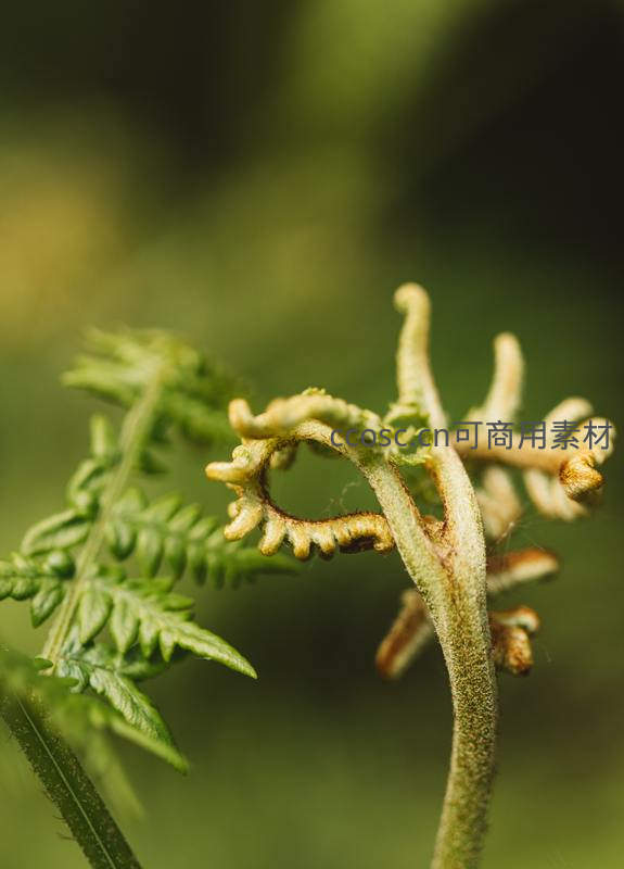新生的蕨叶尚未完全舒展,保持着优美的螺旋形态,茎秆上细小的绒毛在光线下清晰可见,充满生命力。