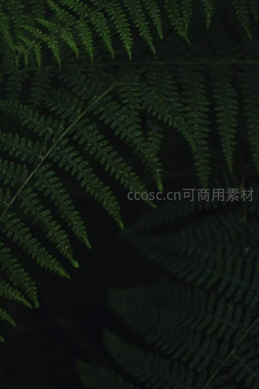 在昏暗的林下环境中,深绿色的蕨类叶片层层叠叠,展现出细腻的纹理与生命的静谧之美。