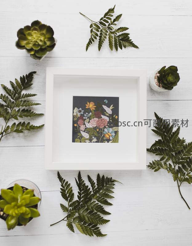 纯白木纹背景上,干蕨叶、盆栽多肉与花卉插画相映成趣,构成一幅充满生活气息与艺术美感的静物构图,传递自然与人文的和谐。