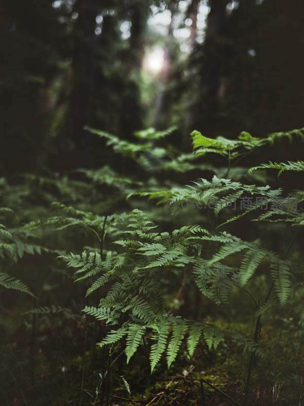 茂密的森林中,阳光透过树冠洒落在层层叠叠的蕨类植物上,营造出如梦似幻的光影效果,仿佛踏入一个远离尘嚣的绿色秘境。