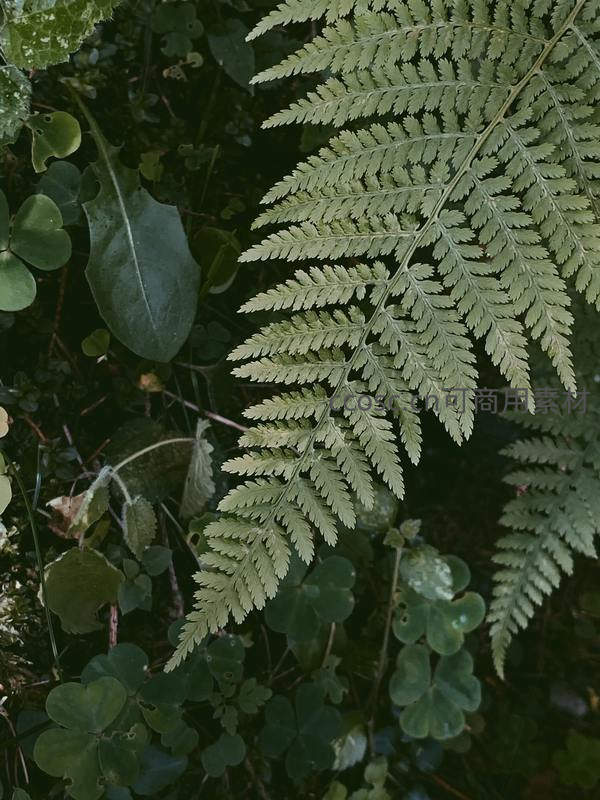 蕨叶舒展于林下,与周围的三叶草及其他小植物共生共存,细腻的叶脉和斑驳的光影共同描绘出一幅宁静而充满野趣的自然生态画卷。