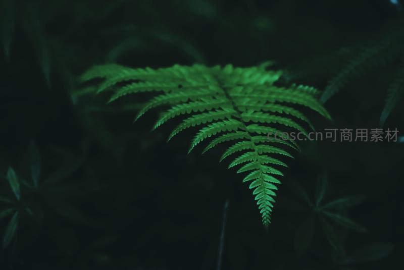 在幽暗模糊的背景中,一片轮廓分明的蕨叶成为视觉焦点,其鲜亮的绿色与周围环境形成强烈对比,凸显了生命的坚韧与美感。