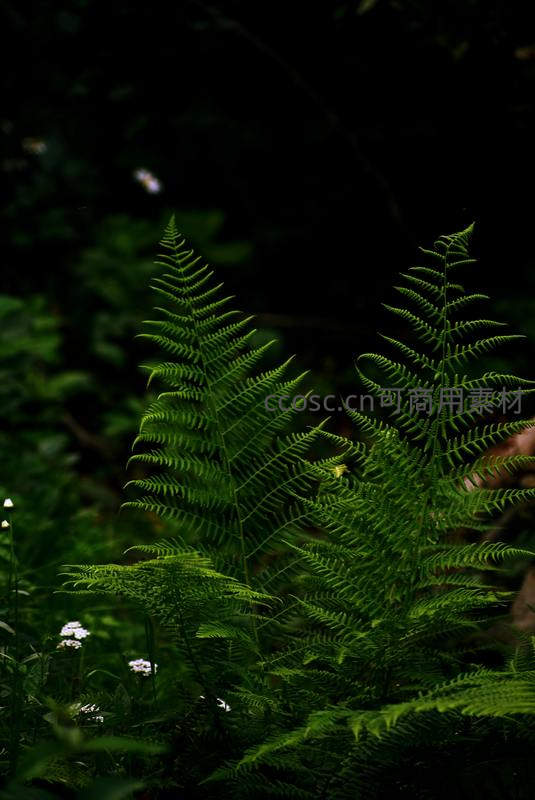 阳光透过树冠洒落在茂密的蕨类植物上,与点缀其间的白色小野花相映成趣,展现了林间充满活力与野趣的自然生态景观。